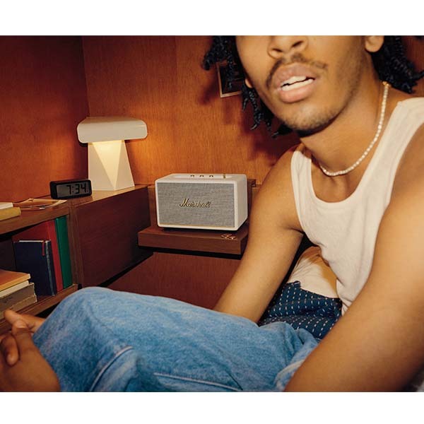 Acton III は Marshall の特徴的なロックンロールホームスピーカーのコンセプトを踏襲しつつ、ロゴプレート、真鍮のコントロールノブなどブランドアイデンティティを洗練されたデザインで表現しています。スピーカーの前面を飾る真鍮のパネルはより細く、流線型になり、フレットは全体的な仕上げに合わせてカラーコーディネートされています。マルチディレクショナルコントロールノブとクラシックなパワースイッチはスピーカー本体を演出し、マーシャルアンプのレガシーを彷彿させます。