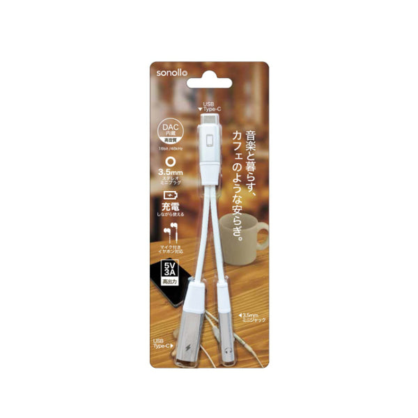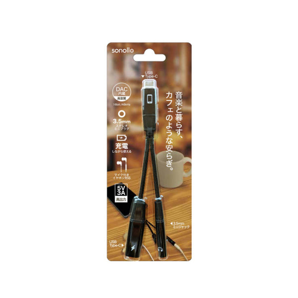 Sonollo(ソノロ)は、USB Type-C端子を3.5mmイヤホンジャックへ変換するDAC内蔵アダプターです。3.5mm端子に加え、充電専用のUSB Type-C端子を搭載しており、音楽を聴きながらスマートフォンの充電が可能です。USB充電ができるカフェや喫茶店などで、音楽を楽しみながら読書や勉強をしつつ充電する――そんな “音楽と暮らす時間” を快適に支えるアイテムです。