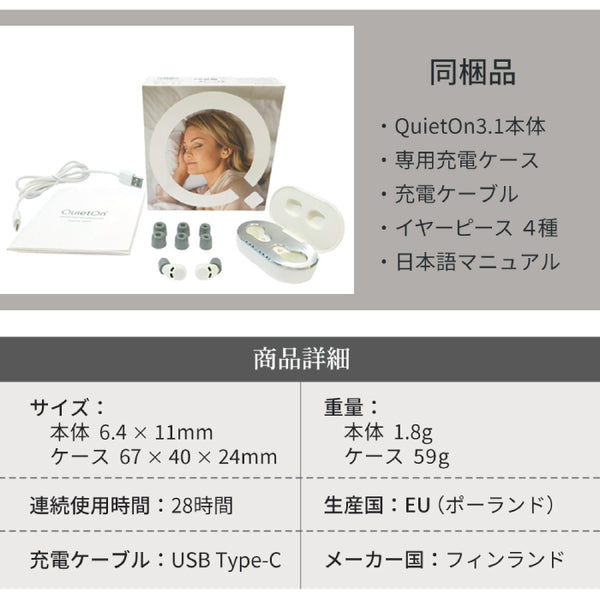 | 重量 | QuietOn3.1本体:1.8g 専用充電ケース:59g |