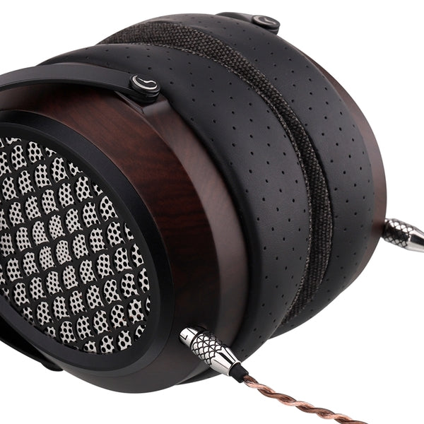 Aiva 2の第一印象は、なんといってもその美しい外観です。SENDY AUDIOのシグネチャーとも言える天然無垢材(ゼブラウッド)のイヤーカップは、手作業による丁寧な仕上げが施されており、一台一台異なる木目が個性を際立たせています。人魚の鱗をイメージしたという金属製のグリルは、開口率を緻密に調整することで音質にも寄与しつつ、見た目にも高級感をプラスしています。