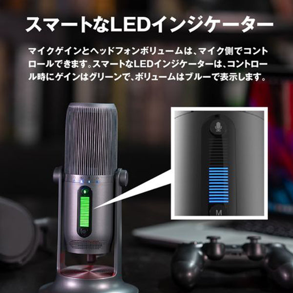 7色LED、マイクゲイン、ヘッドフォンボリューム、レコーディングパターンインジケーター、LEDインジケーター、モード切換え、ミュートボタン搭載