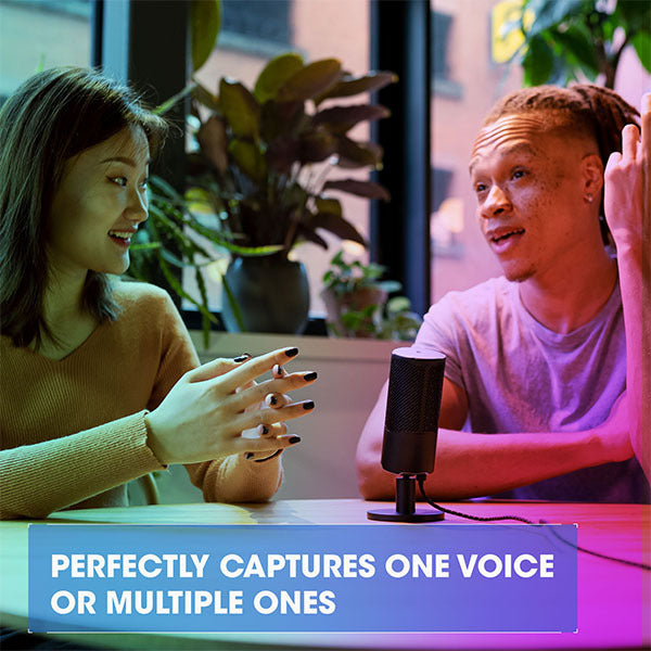 一方、「無指向性」は、ライブパフォーマンスや複数人の声を録音する時と同じように、マイクを中心に全方向からのサウンドを360度均一に収音、大会議室で複数の参加者によるリモート会議、複数の参加者によるポッドキャストなどで活躍します。