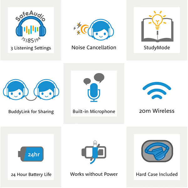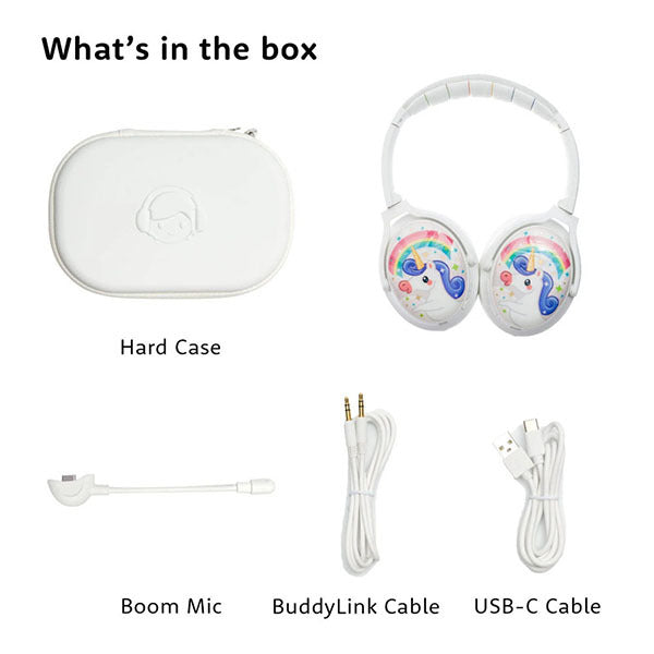 音量制限は 75/85/94dB と 3 段階に調節でき、お子さまの小さな耳を守り、安全で快適なリスニング環境を提供します。独自開発の StudyMode は、お子さまが勉強やレッスンに集中できるよう音声を他の音から分離し、より鮮明でクリアな音声を生成します。