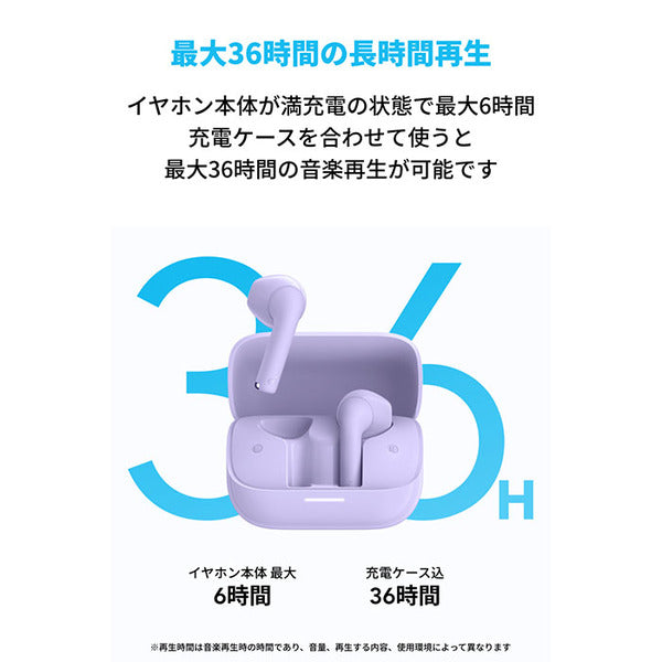 | 連続再生時間 | 最大6時間(イヤホン本体のみ) / 最大36時間(充電ケース使用時) |