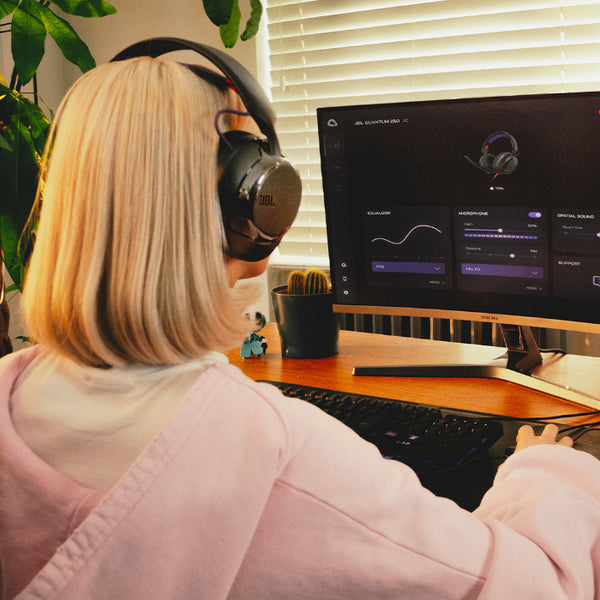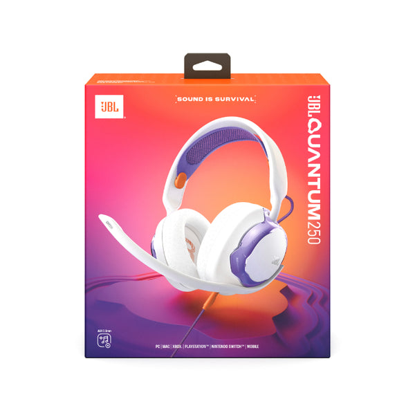 「Quantum 250」は、3.5mm ステレオミニジャック接続に対応した有線モデル。軽量設計と快適なイヤーパッドで長時間プレイにも最適。シンプルながらも JBL ならではの高音質を手軽に楽しめるエントリーモデルです。